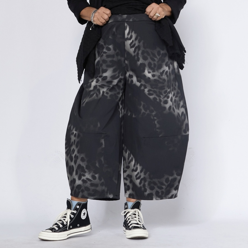 Pantalon en coton avec imprimé léopard. Bande élastique à la taille. Poches latérales rétractables. Coupe ballon. Ajustement large et confortable.