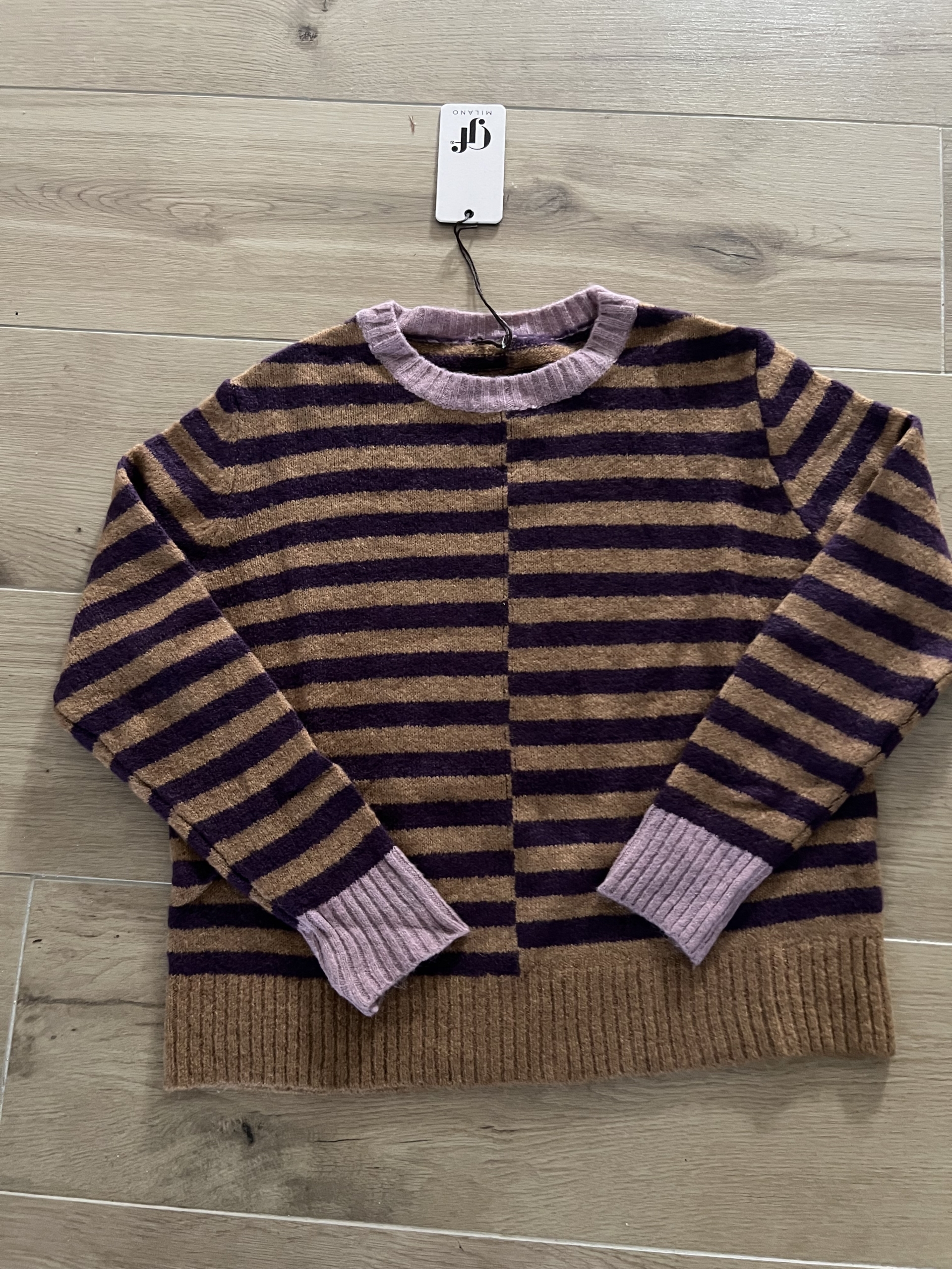 Joli jeu de couleur pour ce pull à rayures en taille unique.
