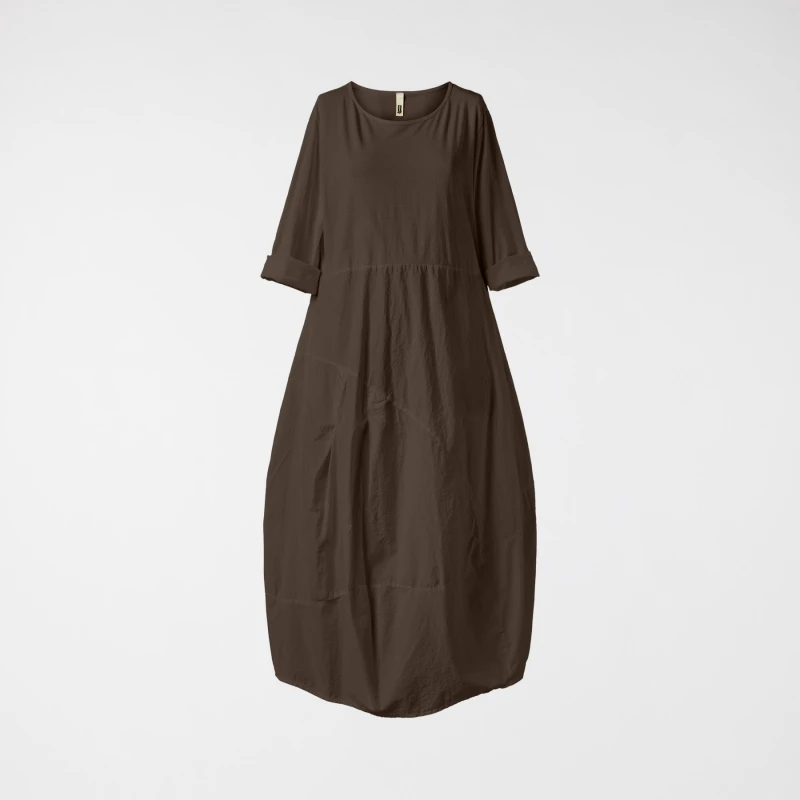 Cette robe longue séduit par sa ligne minimaliste et son volume généreux subtilement structuré.